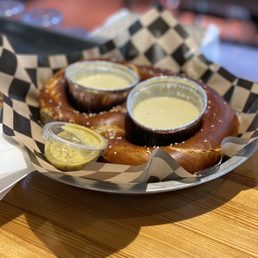 Ended the evening here after trying every other brewery in the area. We were told bar is open seating so we went upstairs and sat ourselves at the upstairs bar. The bartender was awesome. He was so friendly and we talked to him all evening, about beers and traveling. They don't do flights since they're more a restaurant/brew pub with select speciality beers. But he gave us half pours so we didn't have to commit if we didn't like it! It was a wonderful experience, great beer, lively atmosphere, everyone was enjoying themselves. We had a great time and got the pretzel, we ordered the big one and wow.... They weren't kidding. It was way too much for both of us. We wanted a snack and this was a meal. The mustard and cheese was so good though, we ended up eating it all and regretting it. Definitely check them out if you have a large group and want to have a great night out. They had a lot of other drinks to choose from as well and pool tables!